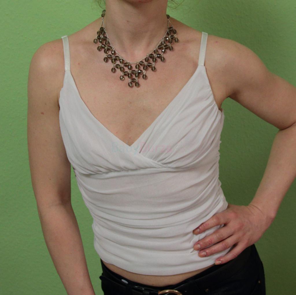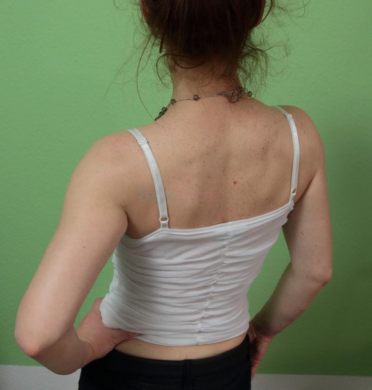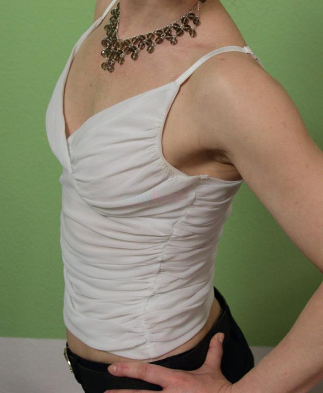 Biele nariasené dvojvrstvé tielko - top, spodná vrstva je hladká. Ramienka sú posunovateľné. Vyzerá dobre do saka s hlbokým výstrihom. Top bol nosený, ale bez vád, akurát biela farba už nemá snehobiely odtieň. Materiál polyester - ľahká sieťovina. Poštovné 2,5 €.